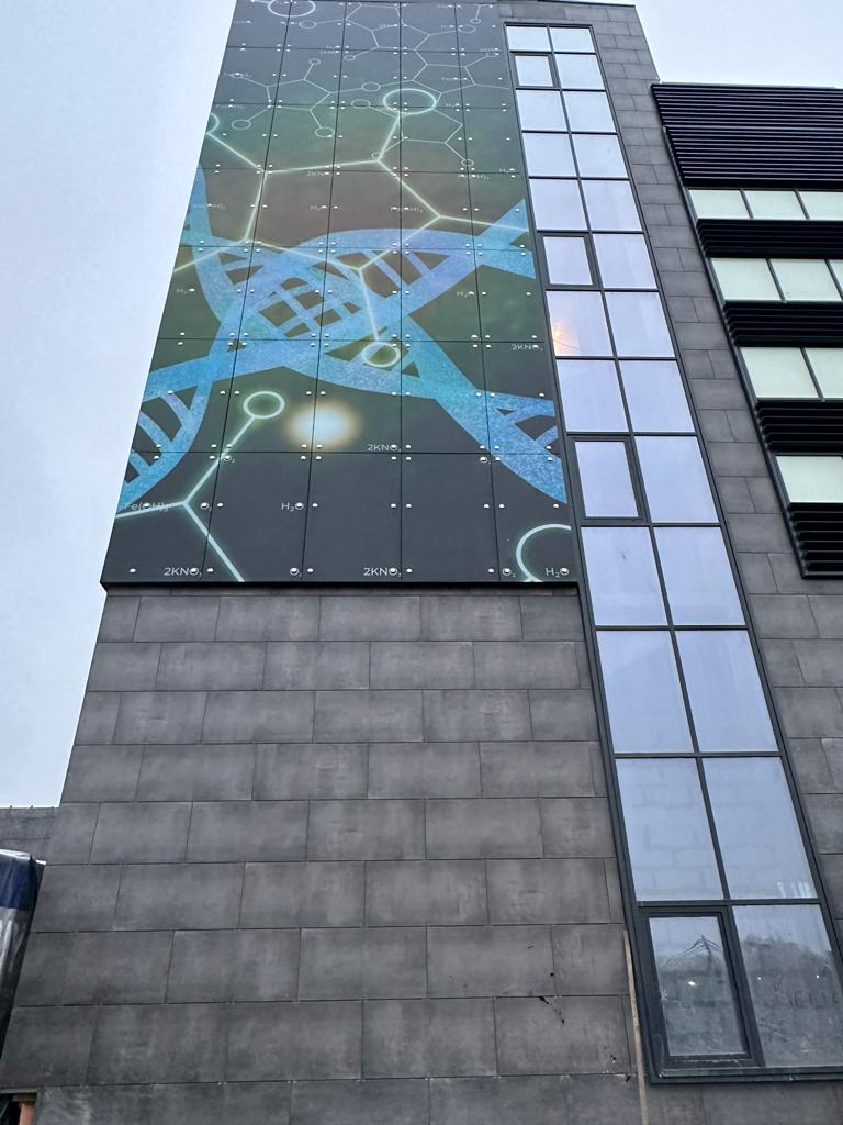 Мы изготовили, доставили и смонтировали алюминиевое остекление на базе системы Сиал. Выполнили устройство вентфасада с применением крупноформатного керамогранита. Разработали дизайн с применением цветной объемной УФ-печати.