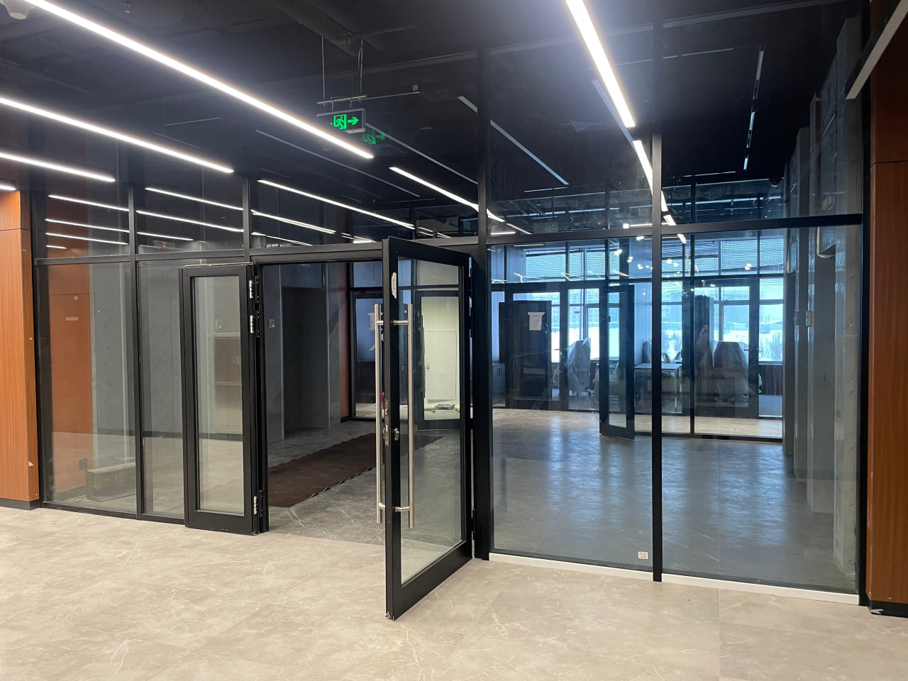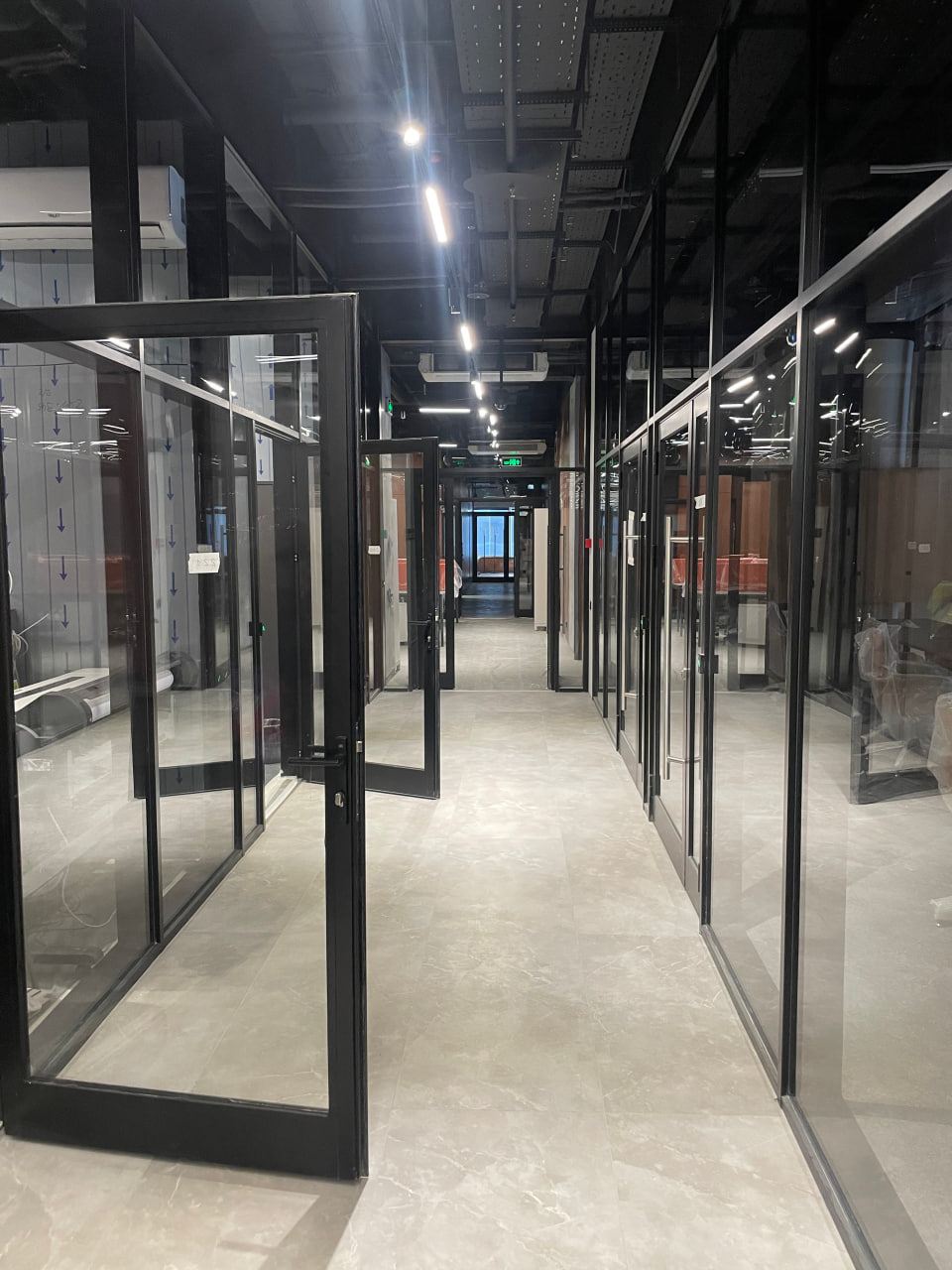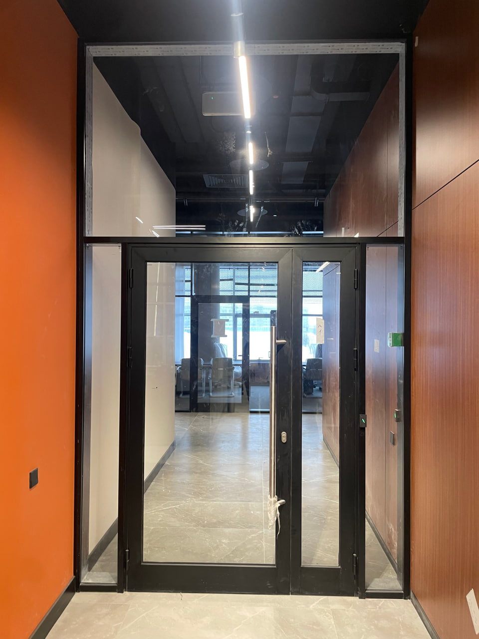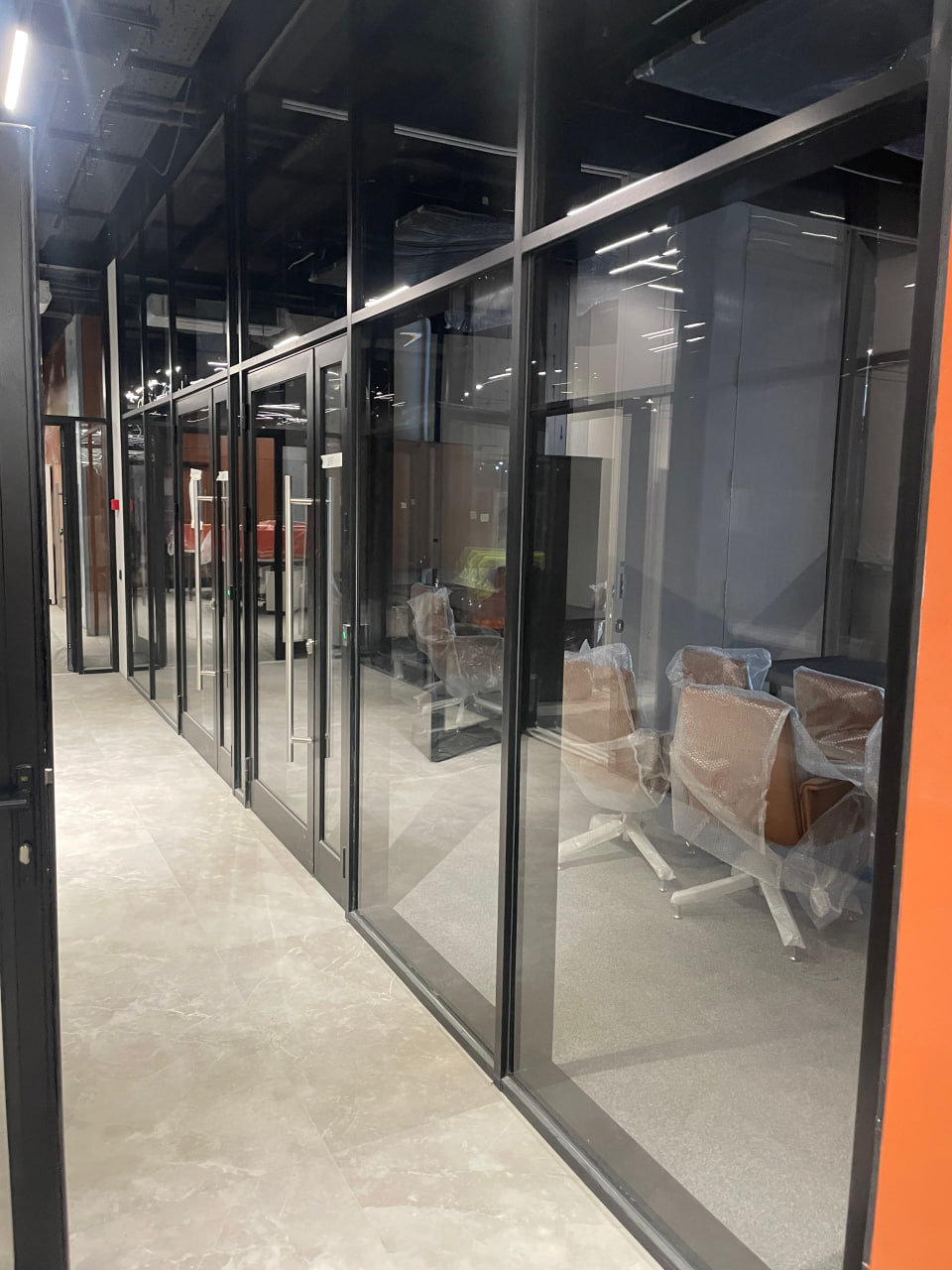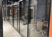 Также мы выполнили на объекте противопожарные алюминиевые перегородки EI45, EI60 из специального узкого алюминиевого профиля 38 мм шириной системы Сиал.