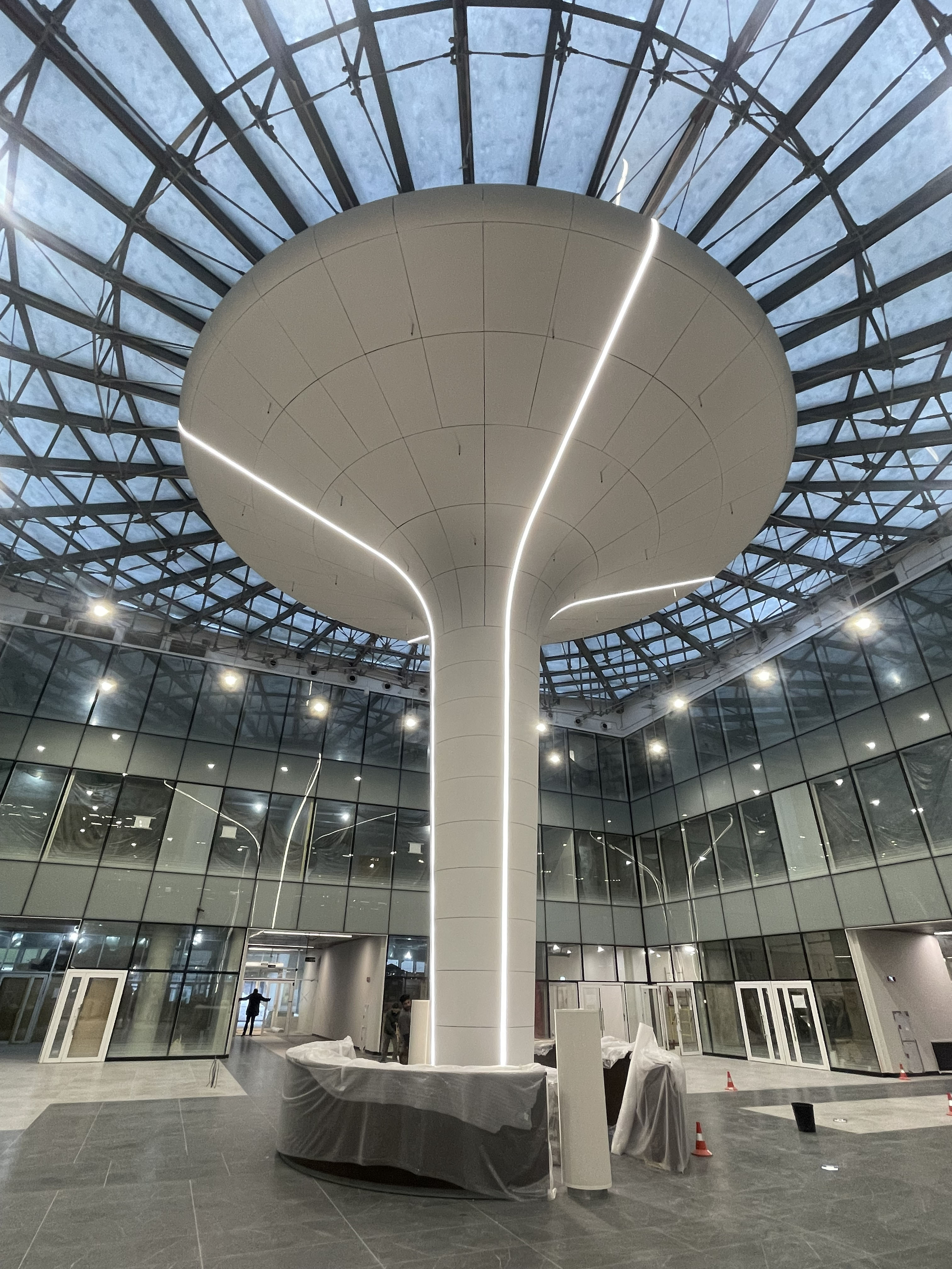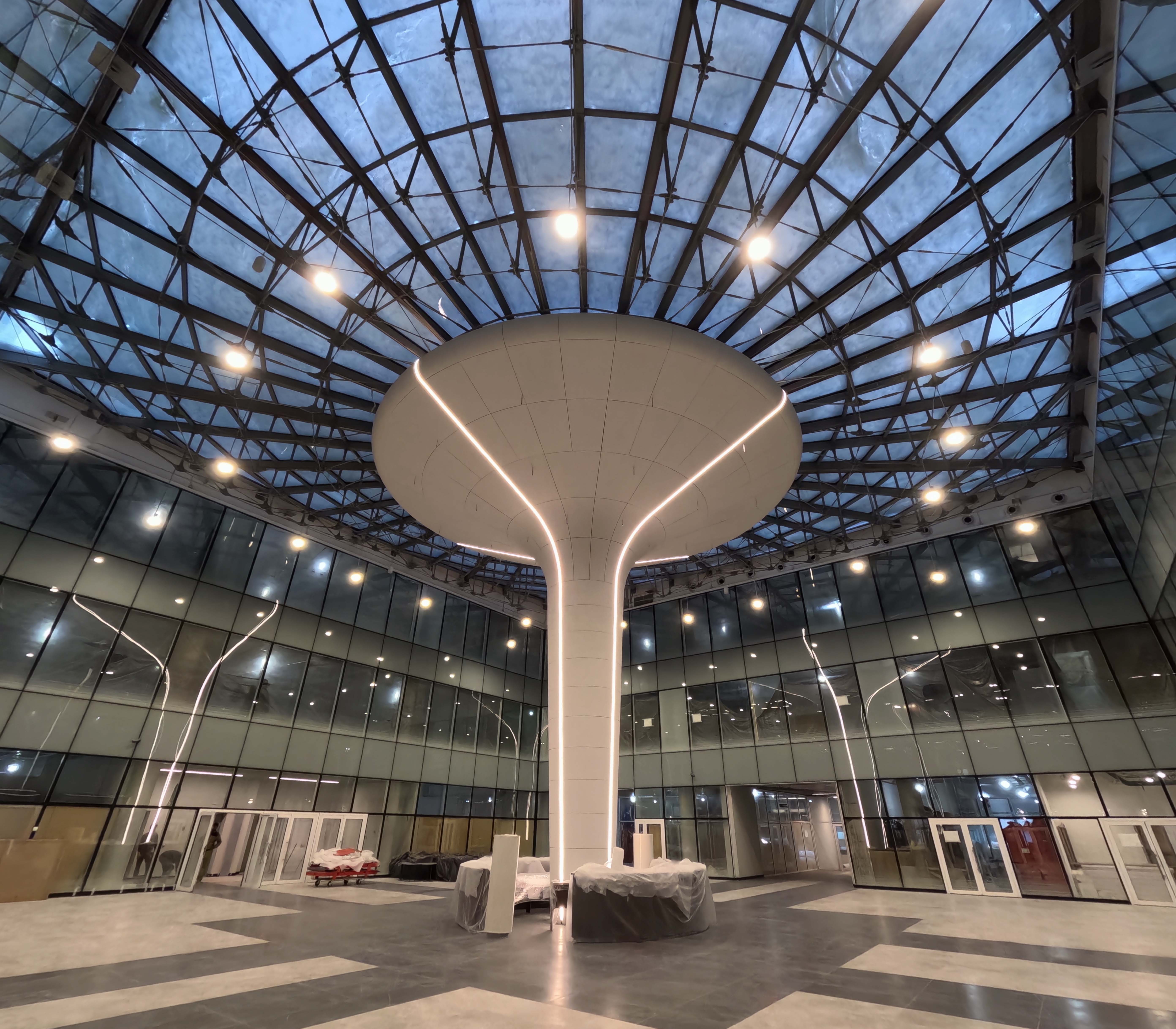 Компания "Окна-Стар" реализовала интересный проект - проектирование, изготовление и монтаж декоративного элемента интерьера из стеклофибробетона с интегрированной системой пожаротушения и подсветки в бизнес-центре "Галактион" на территории инновационного центра Сколково.