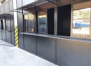 Павильон планируется использовать как пункт питания, поэтому требовалось организовать зону выдачи еды, закрытую от погодных условий. В связи с чем над оконными конструкциями установлен козырек из поликарбоната. В качестве заполнения использованы сендвич-панели 24мм и прозрачные стеклопакеты.