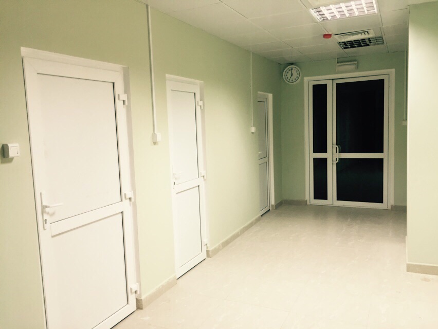 - ПВХ двери Novotex для медицинских кабинетов и внутренних помещений поликлиники площадью 260 м2. В качестве заполнения дверных групп использованы стеклопакеты с тонировкой.