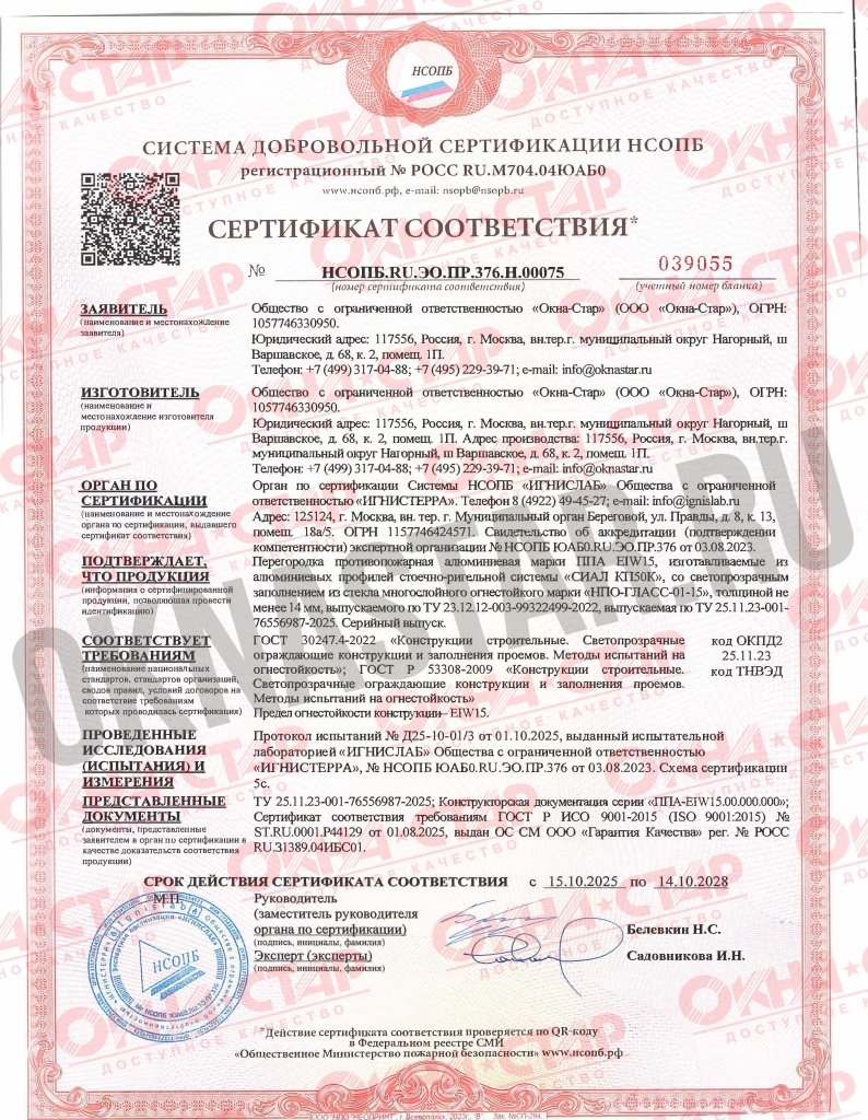 В 2013 г. мы провели успешные испытания своей продукции на огнестойкость, по результатам которых наша компания стала сертифицированным производителем противопожарных дверей класса EIW45 и окон класса E60.