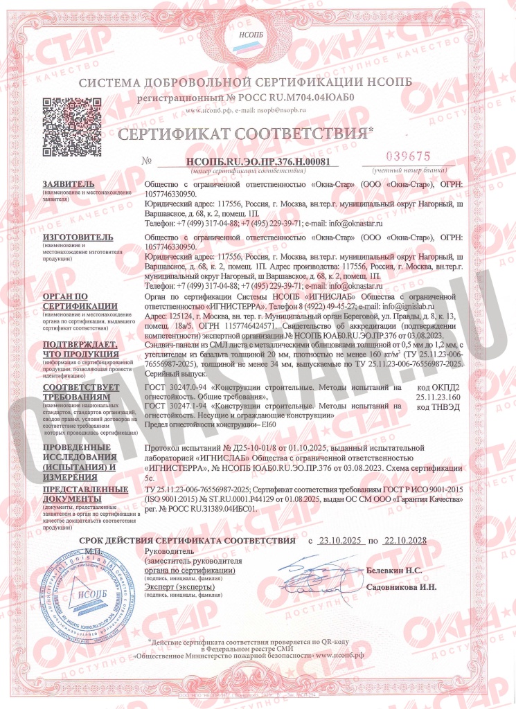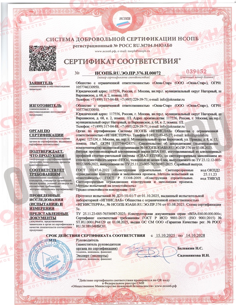 Огнестойкость, сохранение целостности конструкции и защита от теплового излучения в течение 60 минут