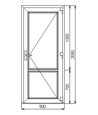 Одностворчатая входная ПВХ дверь из профиля Rehau с порогом. Коричневый цвет. Заполнение: вверху и внизу однокамерный стеклопакет 24 мм. Ручка - нажимной гарнитур, петли дверные 3 шт., многозапорный замок. Дверь открывается на улицу. Вид со стороны улицы: петли справа, ручка слева, открывание правой рукой на себя.