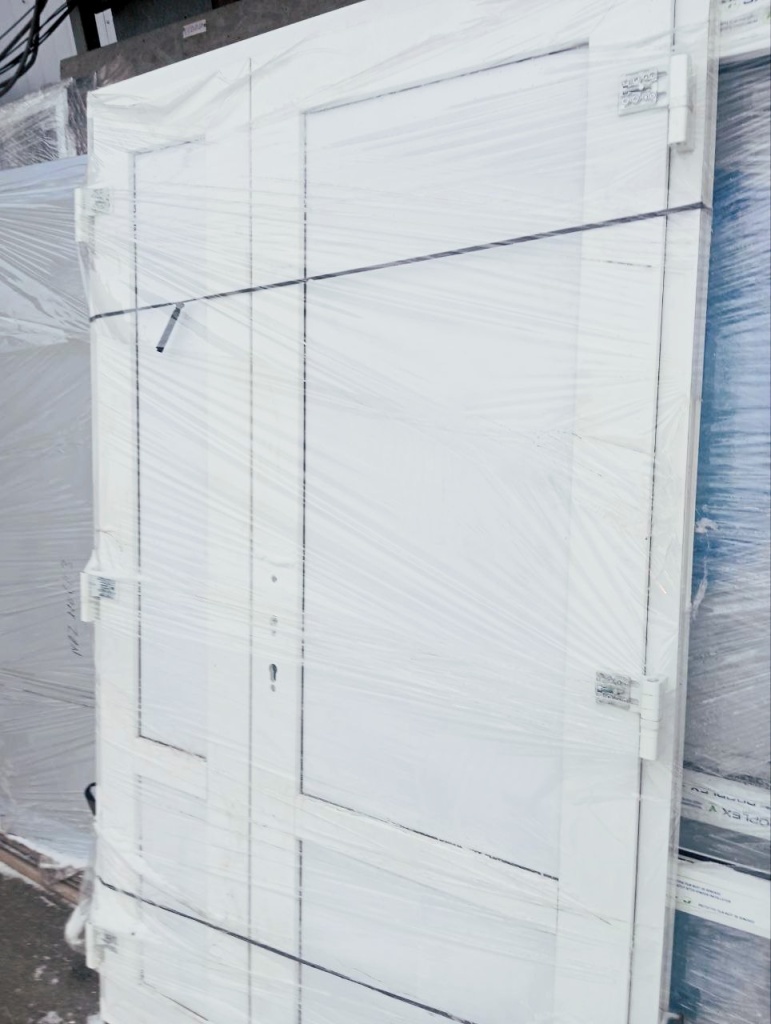 Входная ПВХ дверь с высоким рамным пластиковым порогом, благодаря чему обеспечивается плотное примыкание створок к раме по всему периметру и исключается продувание. Открывание на улицу. Вид со стороны улицы: правая створка рабочая и открывается на себя (на улицу), левая створка фиксируется шпингалетами. Белый цвет. Заполнение: вверху и внизу пластиковый сэндвич 32 мм. Нажимная ручка и многозапорный замок надежно запирают дверь по периметру. Петли дверные по 3 шт. на каждой створке.