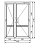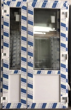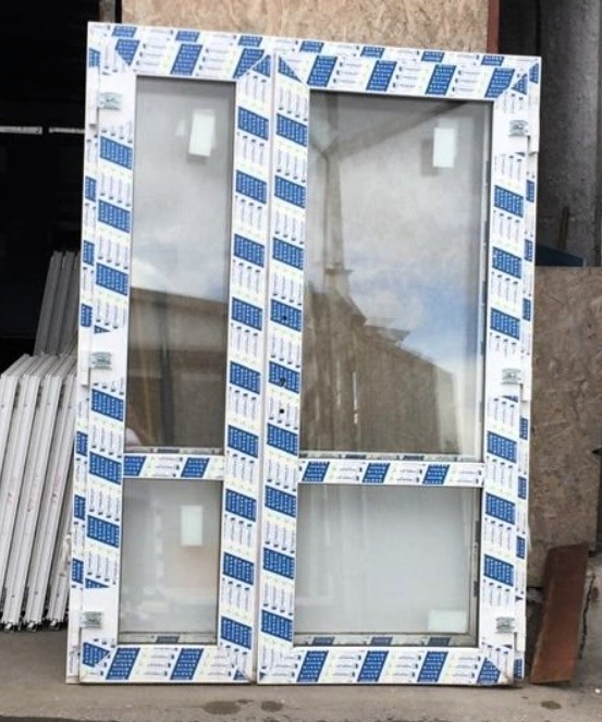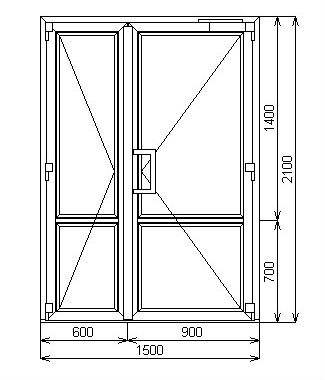 Пластиковая дверь шириной 1500 и высотой 2100 миллиметров комплектуется двустворчатым полотном. Большая створка шириной 900 мм обеспечивает пропускной цикл, а 600-миллиметровая часть фиксируется в проеме на шпингалеты. Обе половины открываются на улицу. В качестве заполняющих материалов применяется стеклопакет (сверху) и сэндвич-панель (снизу).