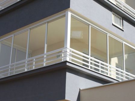 Алюминиевые конструкции могут быть глухими или раздвижными. Как правило, при установке сочетают оба варианта. Такой подход позволяет сэкономить площадь балкона при открывании или закрывании рам. При желании можно установить москитную сетку. Если говорить о цвете, то изначально все створки окрашены в белый цвет, но возможны разные варианты. С улицы такой профиль смотрится весьма аккуратно и современно.
